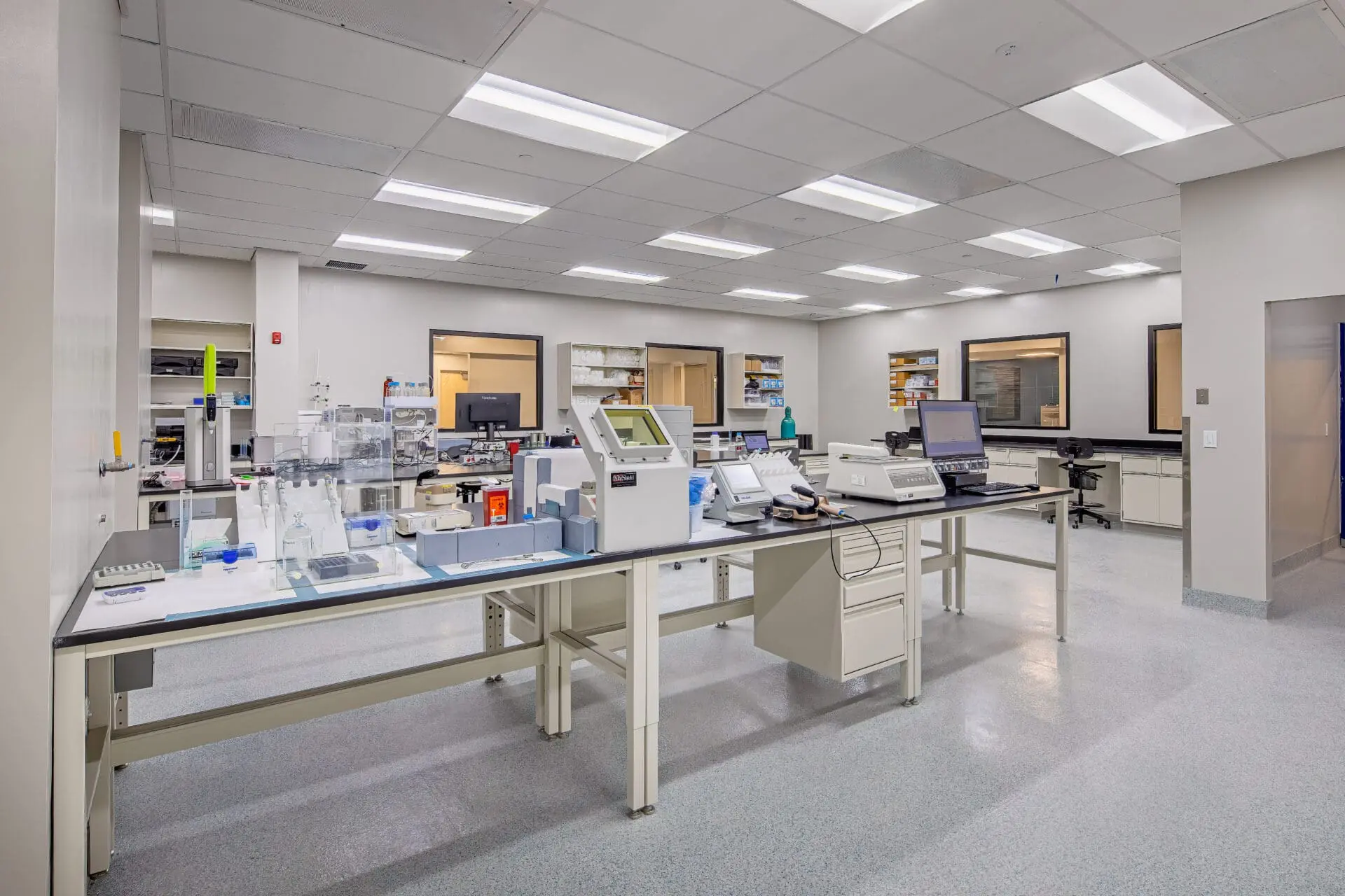 Renovated a 60,000 sf warehouse with an office mezzanine into a radio-pharmaceutical manufacturing facility, including offices on the ground floor and a new mezzanine. Mechanical equipment for ISO 7 and 8 classified rooms was installed on an equipment platform spanning the center of the building. The Plascore cleanroom system was used for the cleanroom areas to ensure compliance with industry standards.